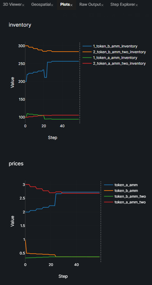 With the default parameters we suggest stepping through the model to observe the price changes from steps 1-50. All the action happens in the plots tab (select it in the top right). It demonstrates price equalizing due to arbitrageur actions and gains to the liquidity provider. Then experiment with different fee/initial token allocations.