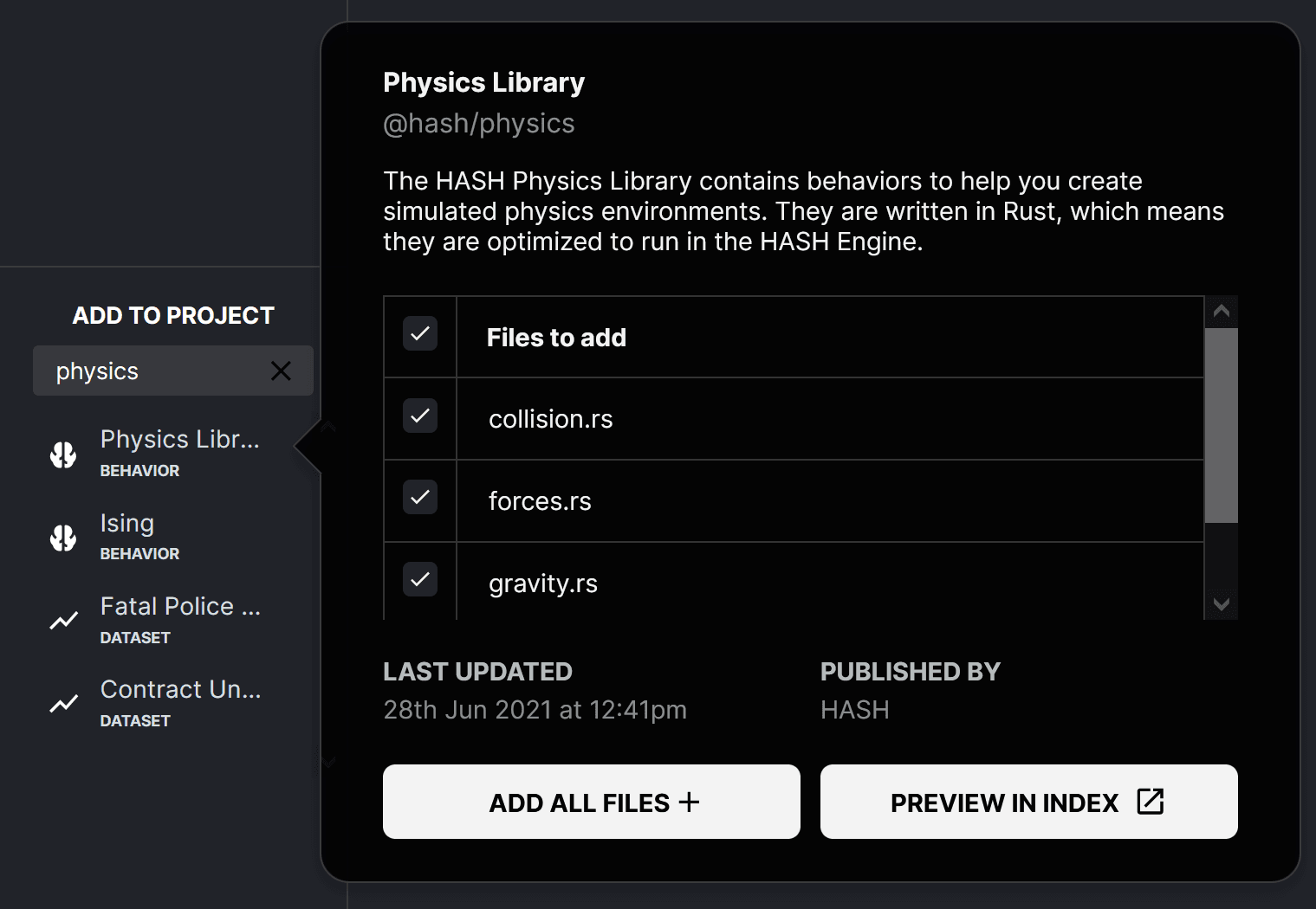 The open-source and newly-released HASH Physics Library provides behaviors that enable the easy addition of simple physics to simulations in HASH. The library is written in Rust, which means that it's optimized to run in our engine. The HASH docs contain more information about each of the behaviors.