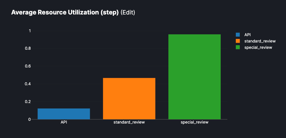We set the different bot and human tasks as service or delay blocks that process the insurance claims at different speeds. As more of the human tasks - like manual review - become automatable, we can adjust the time parameters of the blocks and replace human tasks with bots, and evaluate the downstream effects on business performance. For example, in the following chart, sample parameters demonstrate how much more efficient our hypothetical business could be by investing in more automation of the special review or standard review process.