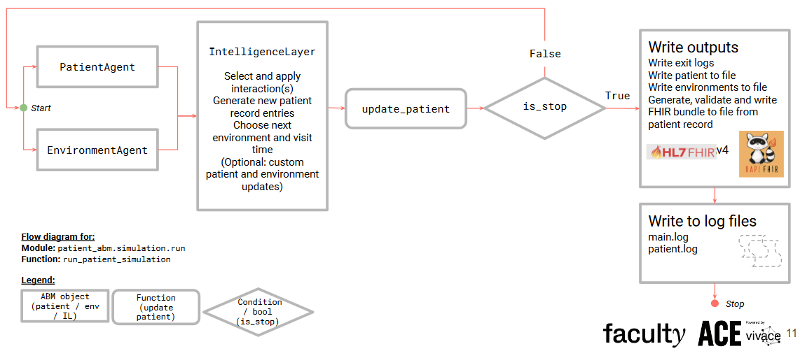 In SynPath, patients and their characteristics are simulated, and they are allocated to an initial environment, as shown in the diagram below. They then go on a journey through different environment objects (health services) which represent patient care and can update their characteristics and patient record.