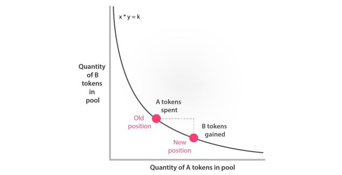 Uniswap is a fully decentralized protocol for automated liquidity provisioning on Ethereum. Building on a Reddit post by Ethereum co-founder Vitalik Buterin, Uniswap is part of a class of automated market makers that use a defined algorithm to set prices for buying and selling tokens. Users can swap token A for Token B at a rate set by the constant product formula x * y = k, where x is the reserve of tokens A, y is the reserves of token B, and K is a constant. As more of token A is purchased, and thus more of token B is deposited, the price of A in terms of B will rise.