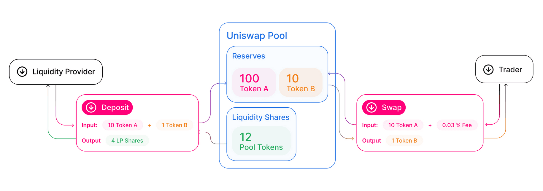 Reserves of the token pairs are deposited by liquidity providers, who “invest” in the pool by depositing a proportional amount of tokens A and B, and receive liquidity shares, which grant them a fractional claim on tokens in the pool. Liquidity providers can redeem their shares and reclaim the tokens, which may in the meantime grow from fees charged during trading.